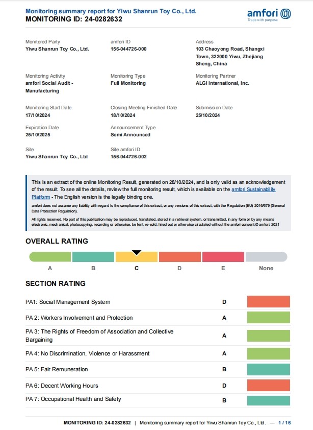Monitoring summary report for Yiwu Shanrun Toy Co., Ltd.